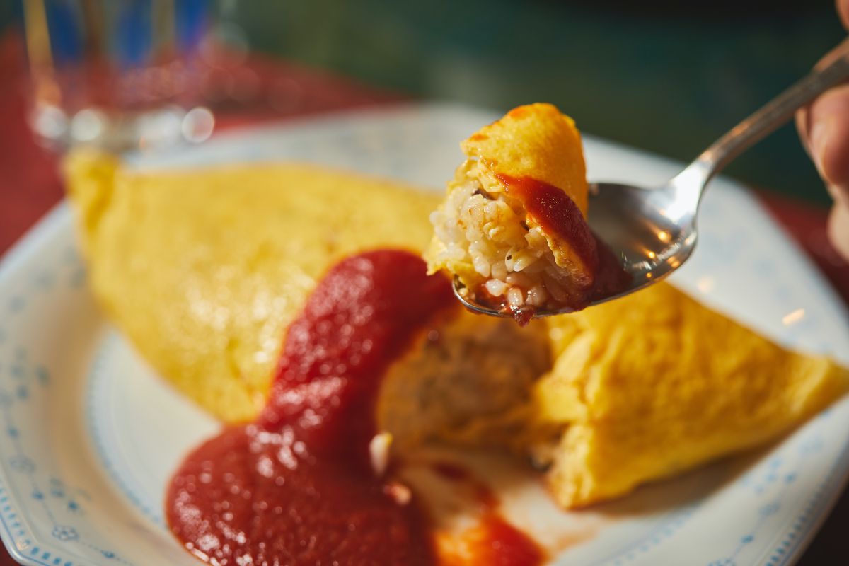 美しく整えられた玉子にスプーンを入れると、中から現れたのはバターライス。こっくりとしたバターにベーコンと玉ねぎとバターのうまみが混じり合ってこれまた美味。玉子は厚みがあって、中はトロトロ。ケチャップ、玉子、バターライスのバランスの良さが抜群です。