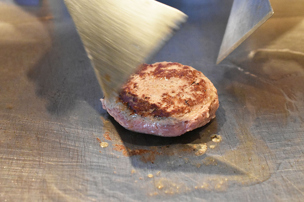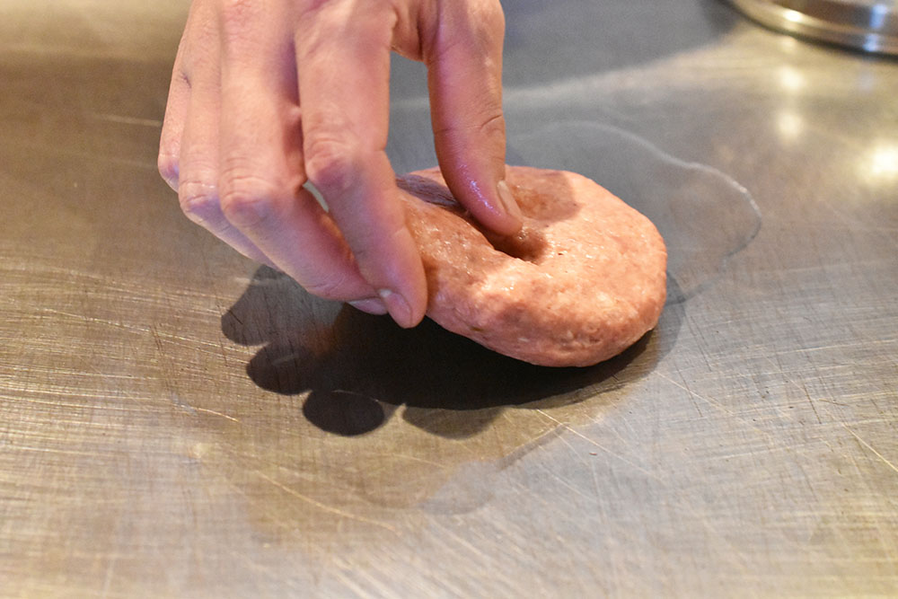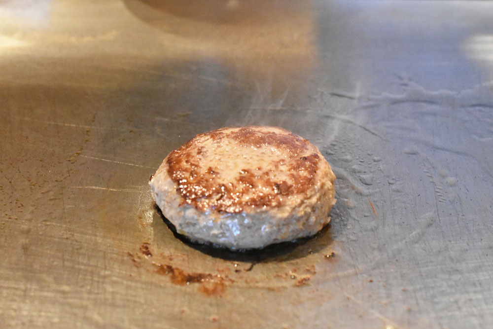 ハンバーグは練り方や成形の仕方で味が変わるそうで、まずは完璧な状態で仕上げられたハンバーグを焼いていきます。