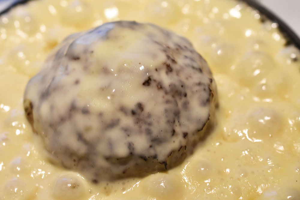 こんなにチーズに埋もれるハンバーグ、見たことがありません♪チーズをこれでもかとかけて、旨味に旨味をプラスします。