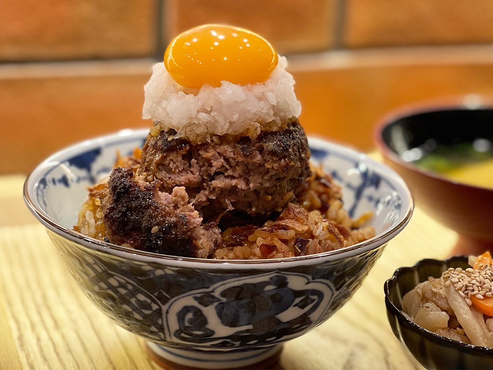 「平戸バーグ丼」は、平戸の棚田米を炊いたごはんの上に、フライドオニオン・イノシシ肉100%のハンバーグ・粗めの大根おろし・卵黄をのせ、自家製のタレをかけたひと品。