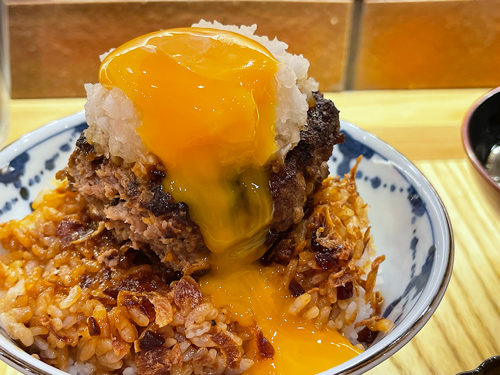 次に卵黄を割ってひと口。長崎のあごだしを使った甘めのタレやパンチのあるフライドオニオンとの相性が抜群!