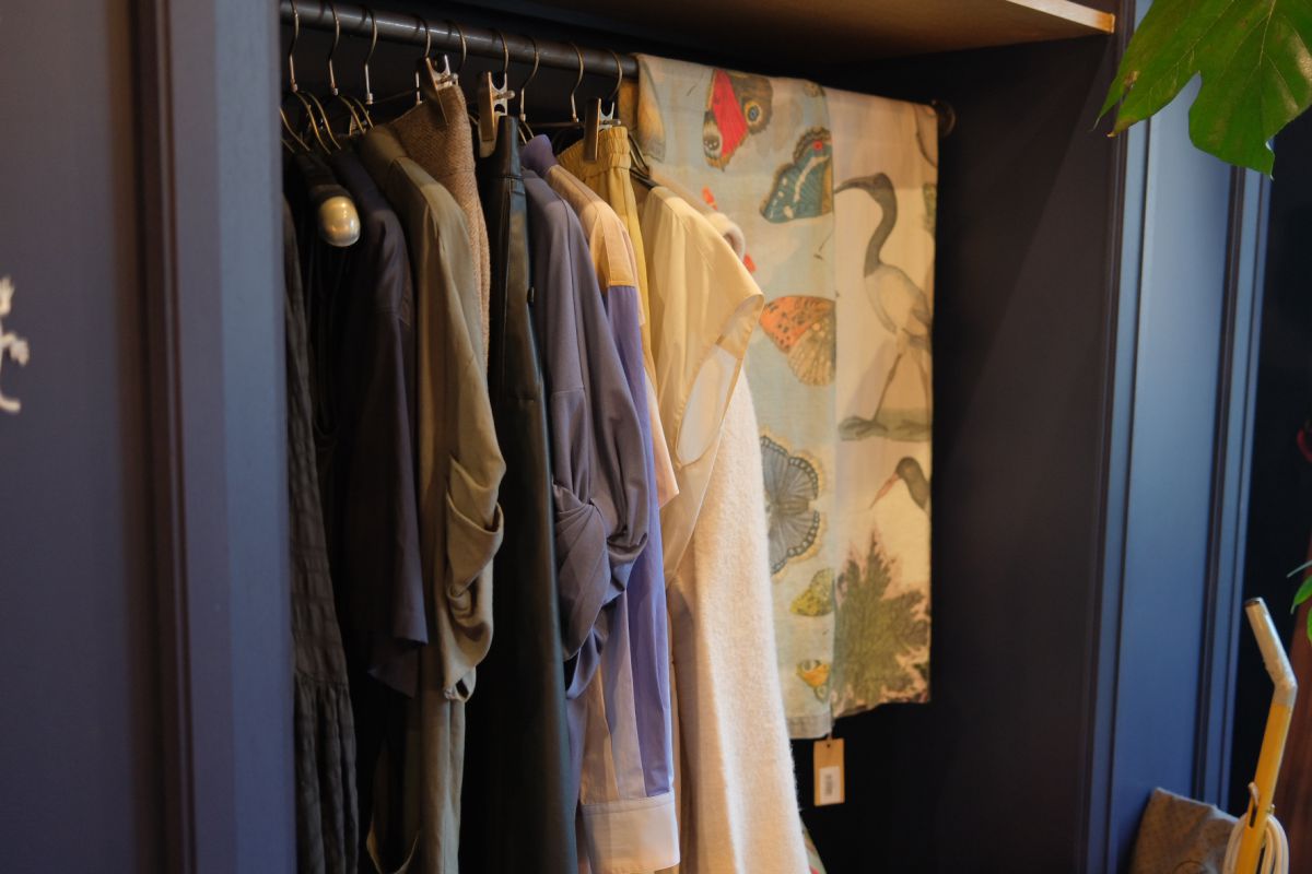 インテリアショップながら、洋服やアクセサリーが並んでいるのも特徴的。こちらの洋服はすべてNYのブランド「SAYAKA DAVIS」のもの。おうちだけではなく服装までトータルコーディネートができますよ!