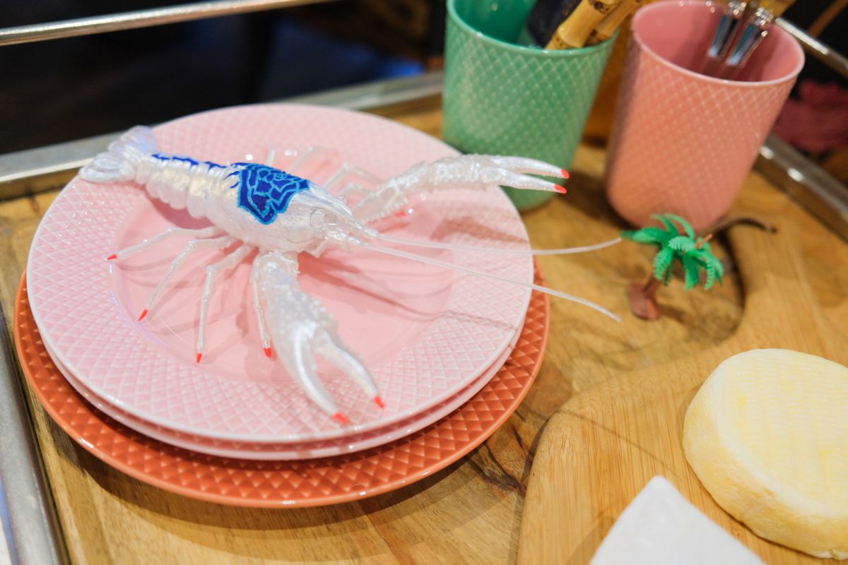 また店内で一番多く見かけたのは、いきものモチーフ。爪先にマニキュアを施した白いザリガニに青いバラを描いた置き物が、まるで食材のようにお皿の上に飾られていたり。