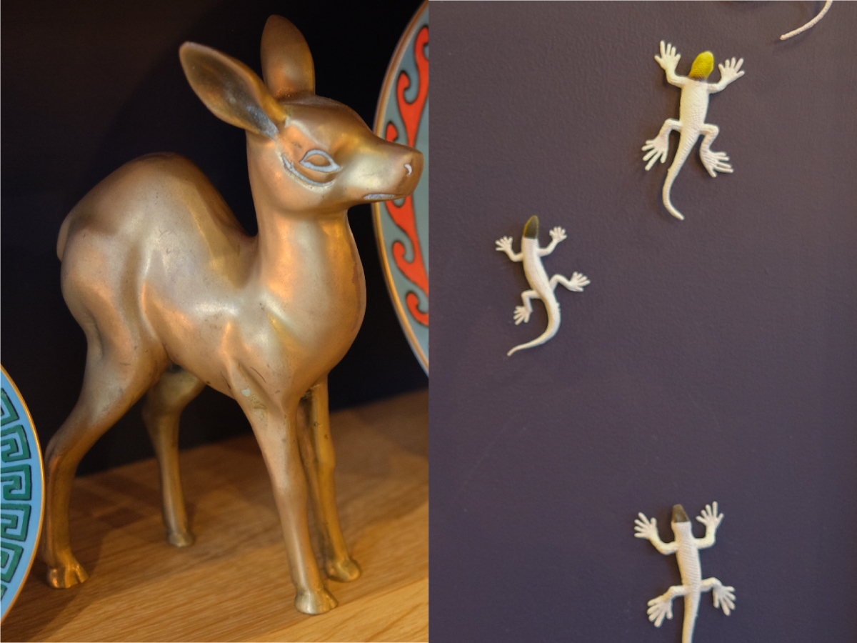 バンビのような置き物があったかと思えば、壁にはトカゲが飾られていたり…。ここでは紹介しきれないほどのいきものモチーフのアイテムが販売されていました。