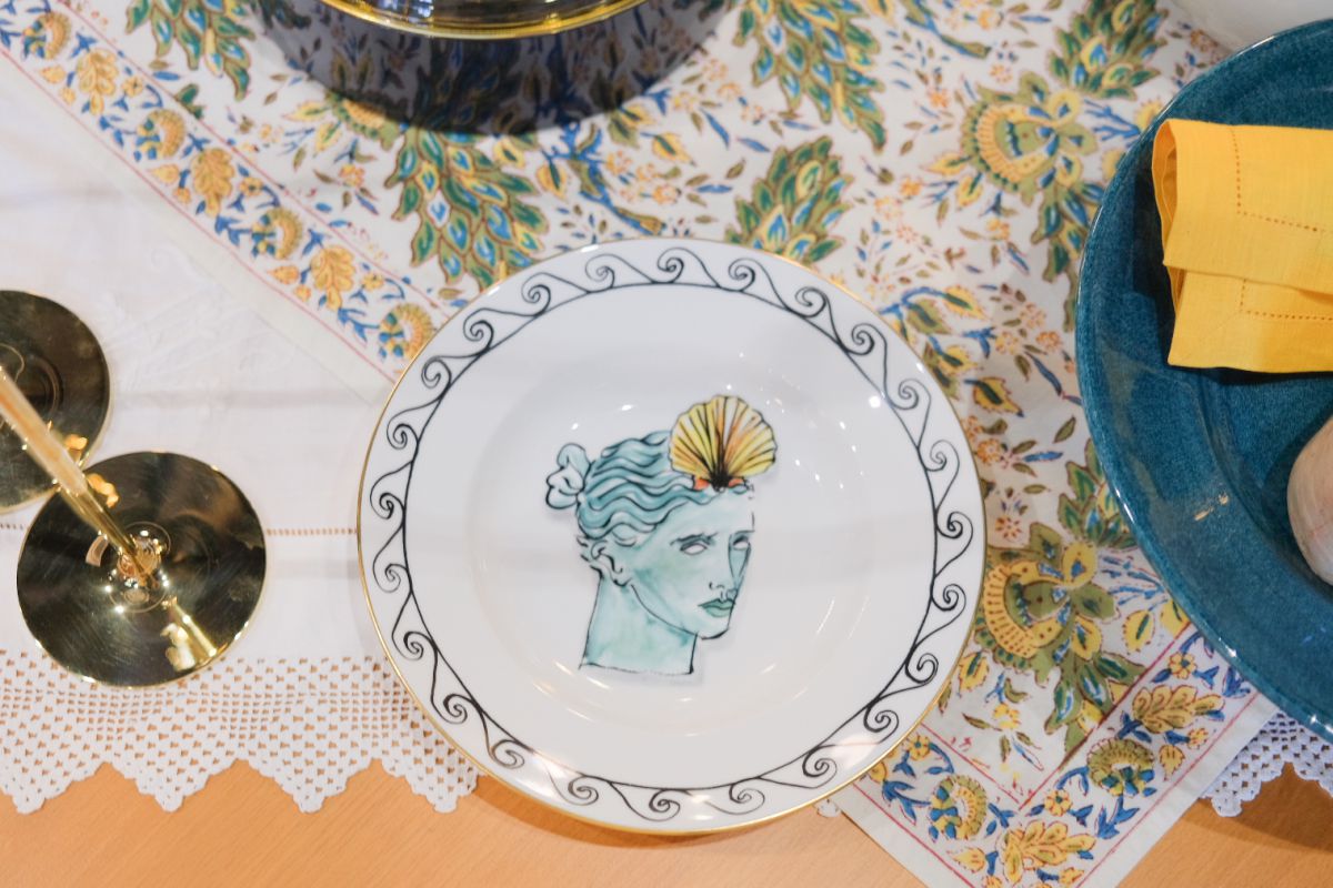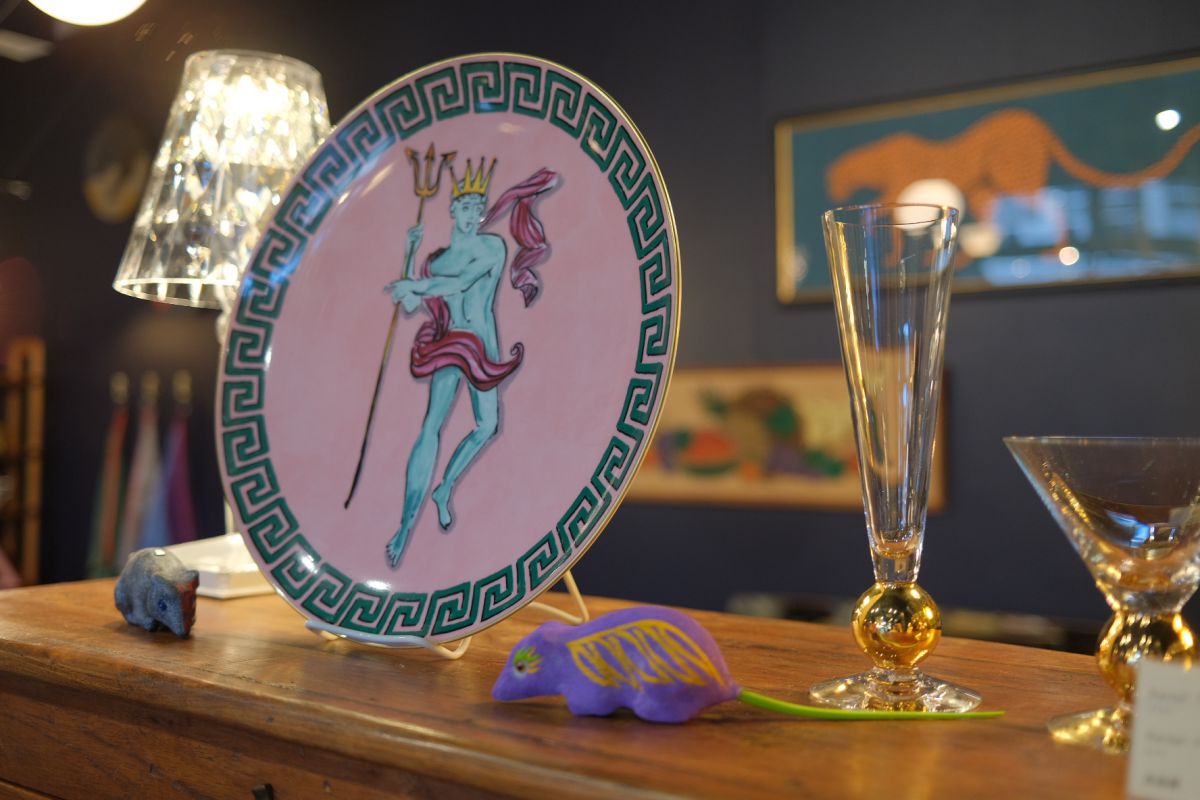 店内の至るところに置いてある、海やローマ神話を彷彿とさせるイラストが描かれた、お皿やマグカップ。写真は、イタリアの総合陶磁器ブランド、リチャードノリのプレート。