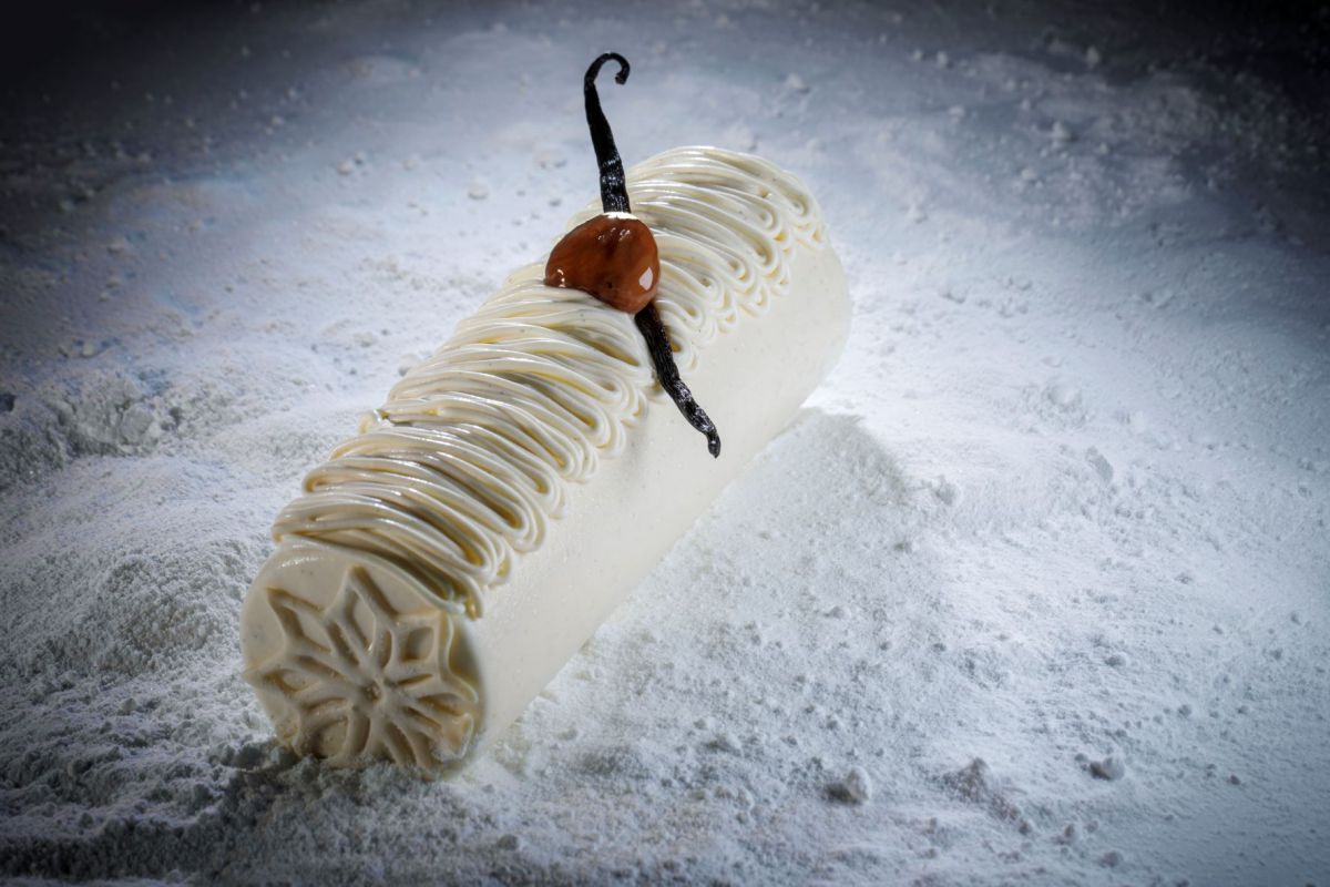 静かに降り積もる雪をイメージしたというクリスマスケーキ。バニラが香るフロマージュブランのムースの下にマロンクリームとスポンジを重ね、シナモンやカルダモンなどのスパイスを効かせた洋梨ジャムも入っています。プラリネクランチのフィユティーヌでサクサクとした食感もプラス。栗とバニラスティックがスタイリッシュなアクセントとなっています。