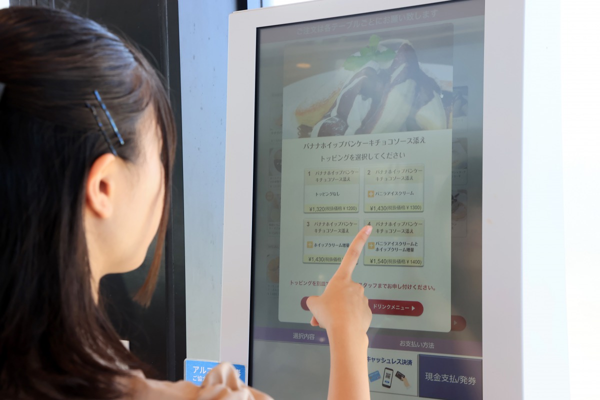 まず、席を選んでから、テーブルにある席番号のカードを取り、店内入口のタッチパネルでメニューを注文します。週末などは行列ができることもありますが、席を探している間にフォトスポットで撮影できるので、待ち時間をあまり気にすることはありません。
