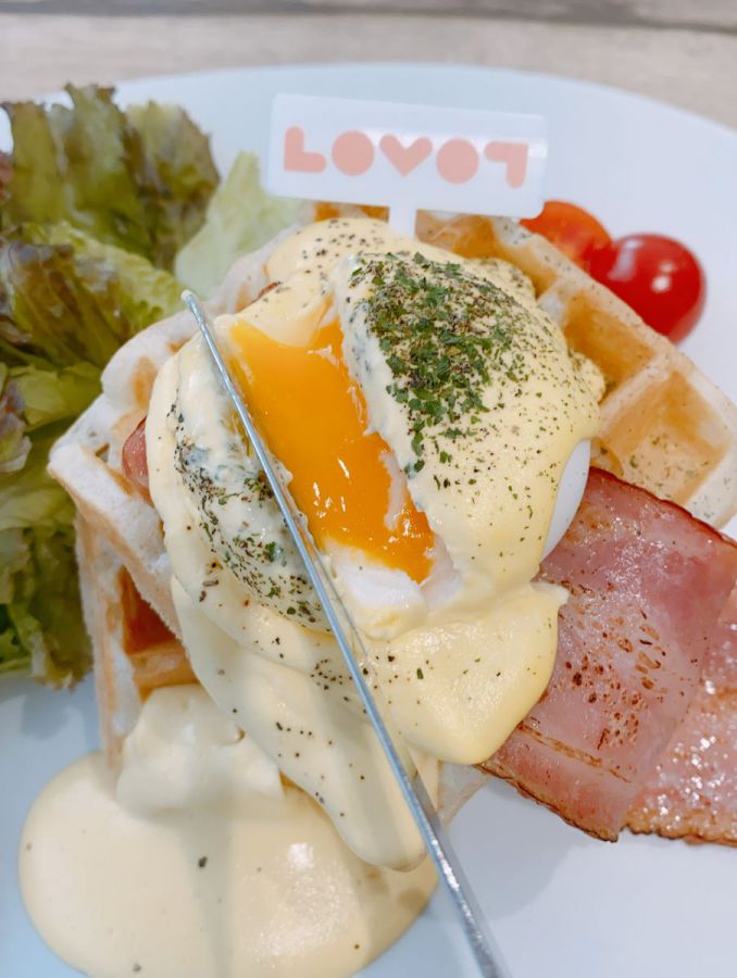 さっくりとしたワッフルの上に、肉厚のベーコンとポーチドエッグがのっており、そこにからむオランデーズソース(卵黄とバターで作られるソース)が全体をまとめあげ、こちらもひと口食べた瞬間に感動を覚えるほどのおいしさ!