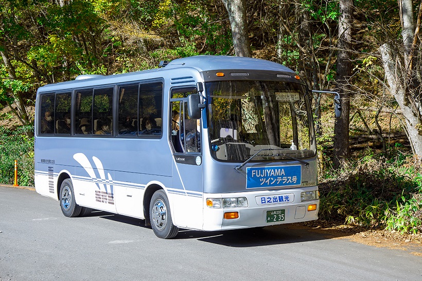 「FUJIYAMAツインテラス」は2021年7月に誕生した、富士ビューが楽しめる話題の展望台です。場所は笛吹市と富士河口湖町の境、新道峠(しんどうとうげ)。一般車両の進入が規制されているため、送迎バスに乗って向かいましょう。20人乗りのバスは「沢妻亭」、「おごっそう家」、「藤原邸」、「すずらん群生地」の順に停車し、FUJIYAMAツインテラスまでは10~35分ほど。芦川沿いや緑豊かな山道をぐんぐんと登って到着。