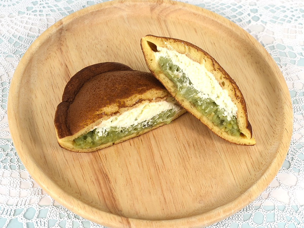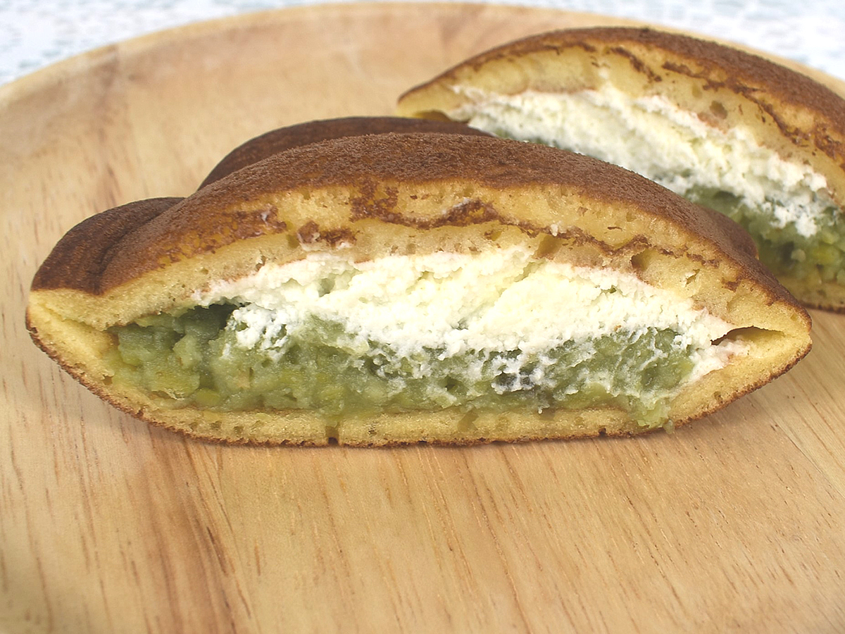 一見至ってシンプルなどらやきかと思いきや、切り分けた断面からはきれいな緑色をしたずんだ餡とたっぷり入ったホイップが登場しました。さっそく一口頬張ってみたところ、枝豆特有の風味とまろやかなホイップの甘みが口の中で爆発! コク深い甘みと優しい塩味がハーモニーを奏でます。噛むたびに鼻に抜ける爽やかな枝豆の香りに加え、豆感が残るつぶつぶした歯ごたえもたまりません。さらにミルク味が強いホイップと合わされば、味の相乗効果で口の中が幸せいっぱいに…。