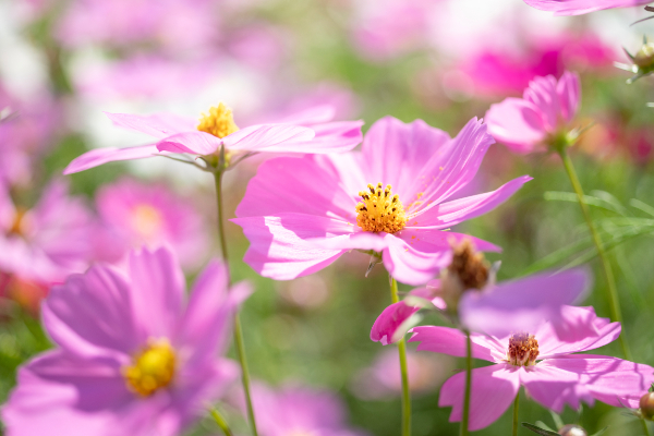 パークの一番の見どころは、3000㎡もある広い花畑「花ひろば」。コスモスは毎年10月初旬から咲き始めます。見ごろを迎えるタイミングは毎年変わるそうですが、だいたい10月半ば以降。ピンクや白など鮮やかなコスモスが一面に咲く様子は圧巻です。