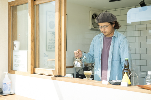 緑地広場にあるコンテナカフェ「TIME DRIP COFFEE(タイムドリップコーヒー)」は、ナチュラルな雰囲気が素敵なご夫婦が営む、コーヒー専門店。最上級のスペシャルティコーヒー豆を1杯ごとに挽いて淹れるハンドドリップコーヒーや、エスプレッソベースのカフェオレが人気です。