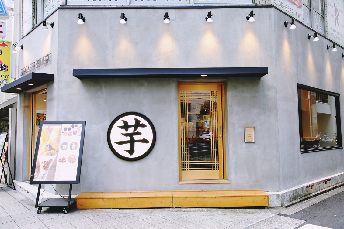 大阪では7店舗あるうちの一つ、こちら大阪新町店は大阪ミナミエリアでは唯一(2021年10月現在)の店で、心斎橋や堀江からも徒歩圏内のビルにあります。「さつま芋のおいしさを伝えたい」というシンプルなコンセプトを表すようなすっきりとスタイリッシュな外観で、大きな「芋」の看板が目印です。店内はカウンターとテーブルの12席。陽光が差す明るい店内で、じっくりさつま芋スイーツが味わえます。