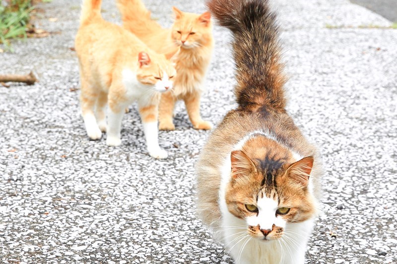 いよいよ深島に到着!深島は島の周囲約4km、島民15人の小さな島です。そこになんと約80匹の猫がいるそう。島の中央へ向かっていると、さっそく猫たちがやってきました!毛並みがきれいで、人を全く怖がりません。