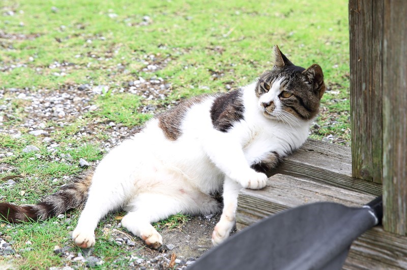 ベンチの下で微妙な姿で休んでいる猫を発見!写真を撮りまくります。中にはなでなでさせてくれる子もいて、一向に前に進みません(笑)。