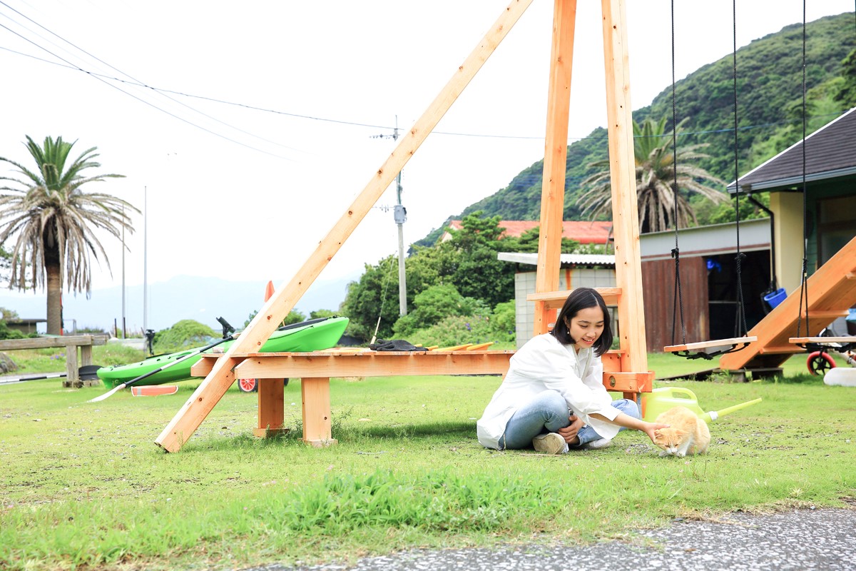 島内には猫スポットが3カ所あり、すべて深島の船着場から徒歩5分以内で行くことができます。一つ目は「深島みそ工房前」。芝生広場に木製の遊具が置かれ、そこかしこに猫が隠れています。