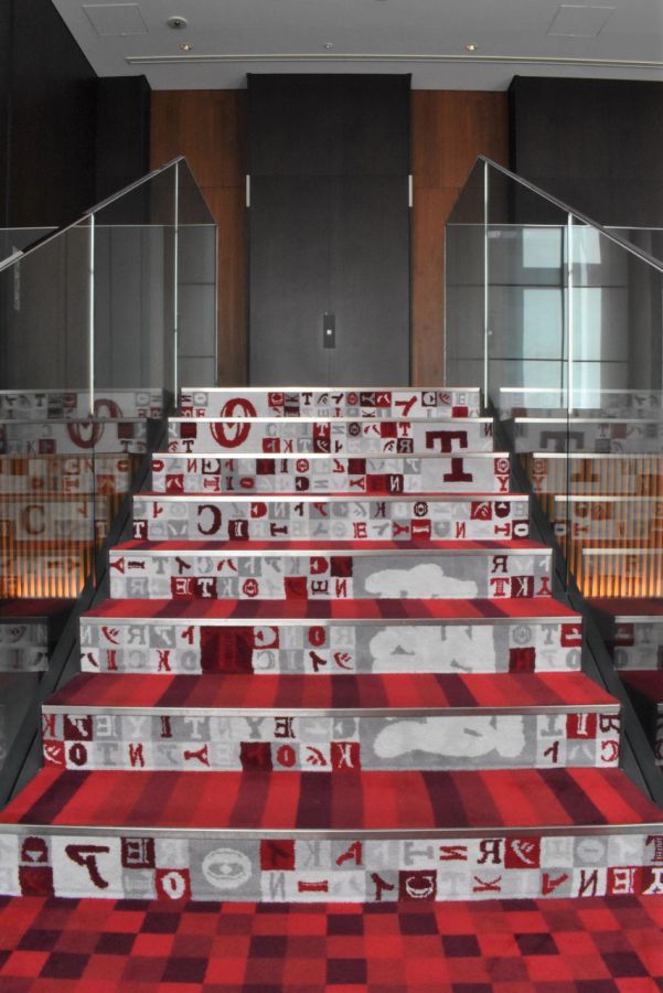 そして、このアートにはもうひとつ仕掛けが!ロビーの絨毯の柄をよく見てみるとちょうど、ガッチャンとこの文字がプリントされたようになっているのです。