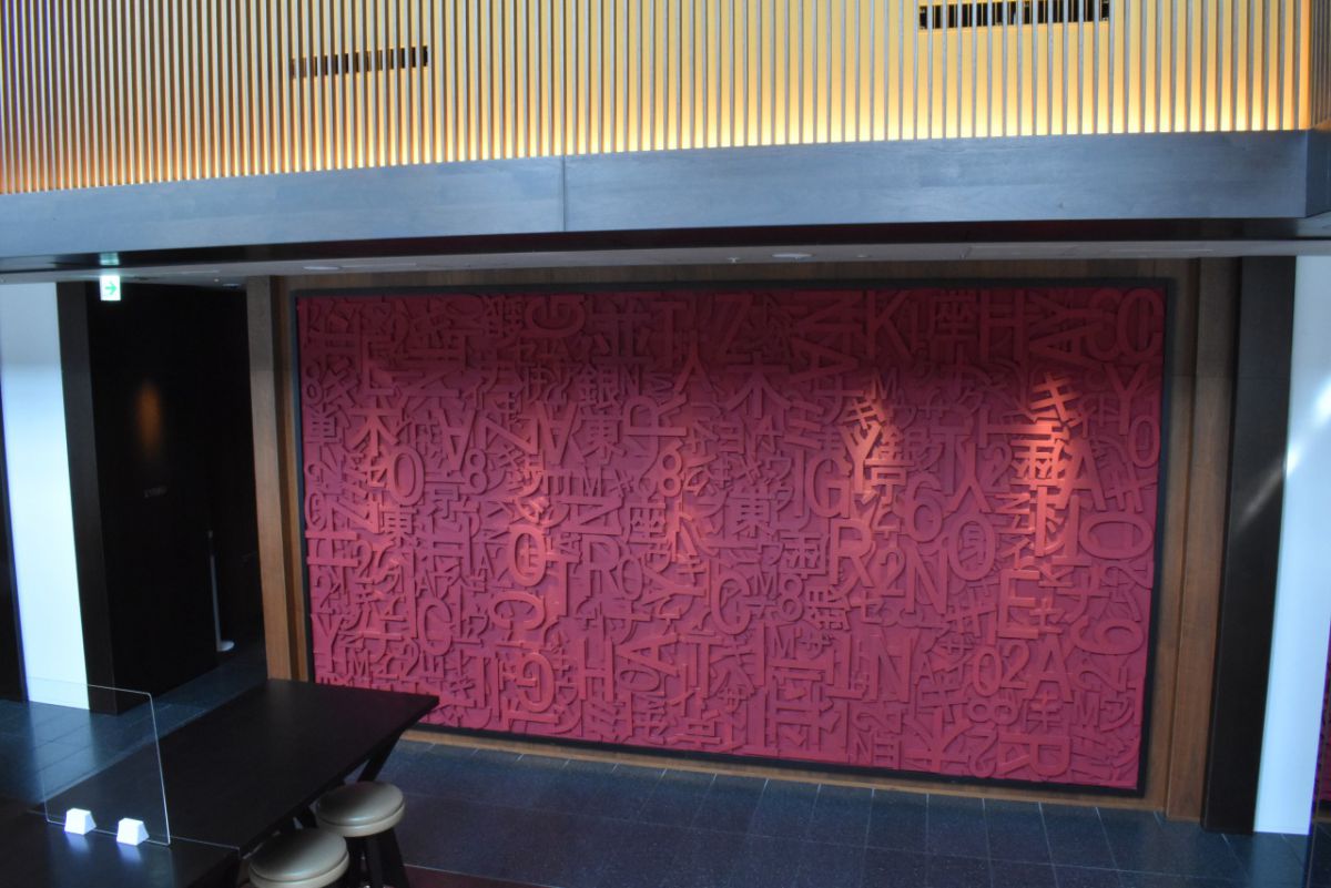 ロビーラウンジでまず目に飛び込んでくるのは、吹き抜け奥にあるアートボード!活版をモチーフにしているため、文字が逆になっています。