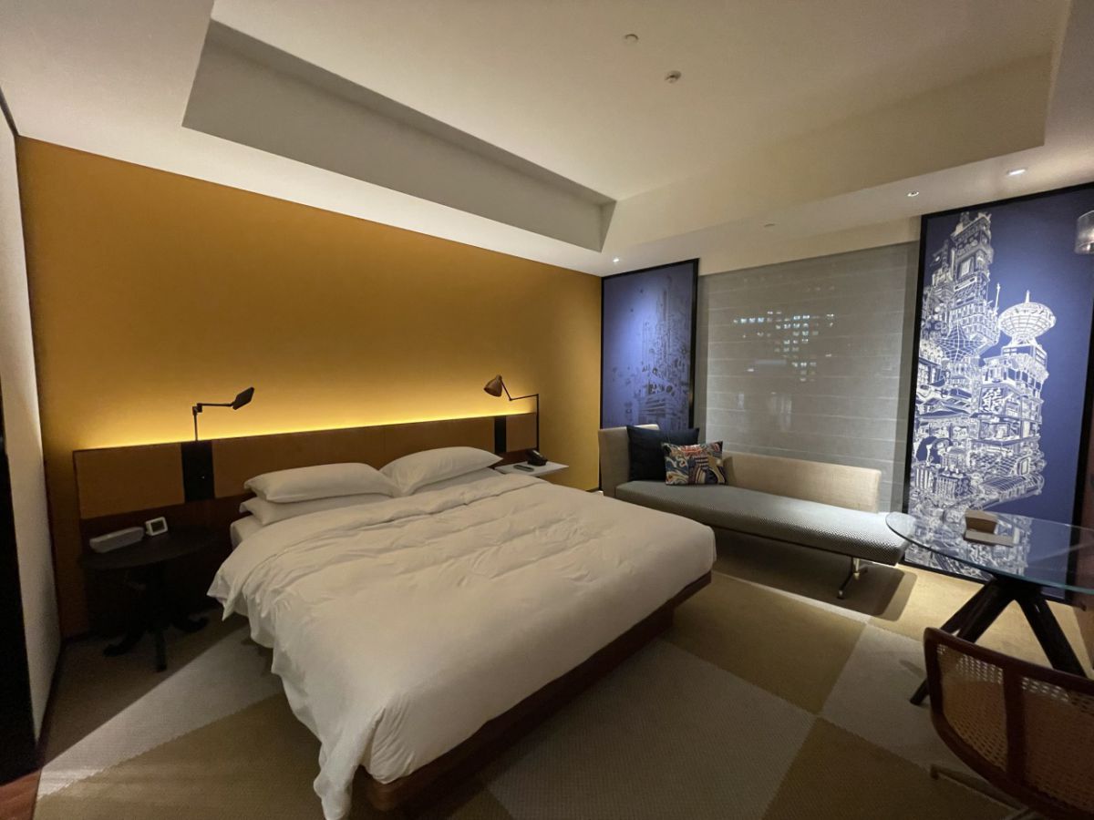 今回、宿泊したのはキングベッドが1台ある「スタンダード キング」タイプのお部屋。黄色の壁紙と窓の両側にある「襖アート」がおしゃれな和洋折衷な雰囲気です。