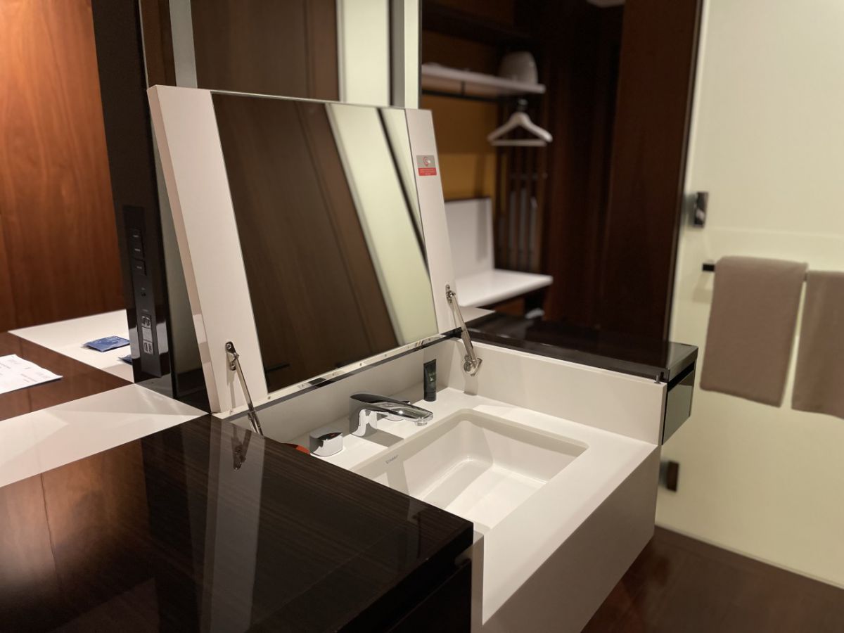 お部屋の中で最も感動したのがこの「ファンクションテーブル」。 その名の通りたくさんの機能が備わっていて、洗面台かつワークデスクかつ冷蔵庫でもあるというまさに魔法のテーブル!