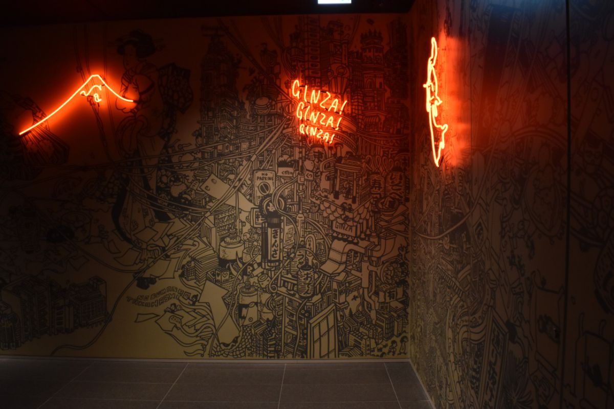 襖アートのテーマはもちろん銀座。細かいところまで表現されていてじっくりと眺めてしまいました。ちなみに、階によって絵柄が異なるそう。