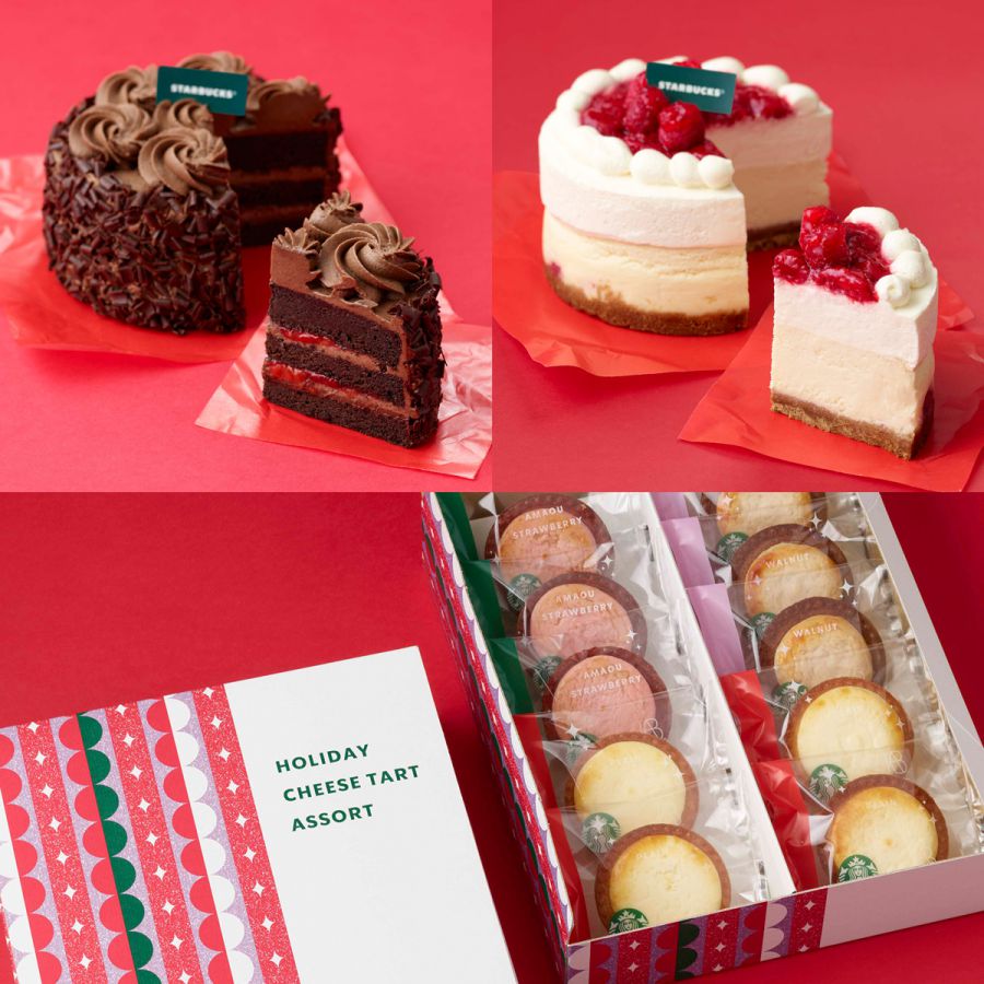 スターバックスで2021年11月1日(月)から販売されるクリスマス時期限定スイーツは、店頭で購入できるもののほかに、オンラインストア限定品もあります。ラインナップは3品。雪をイメージした真っ白なニューヨークチーズケーキに、ラズベリーとストロベリーソースが飾られた「ホリデーチーズケーキ」と、ドイツ南西部発祥のケーキにインスパイアされた「チョコレートフォレストケーキ」はホールケーキなので、クリスマスケーキとしても♪