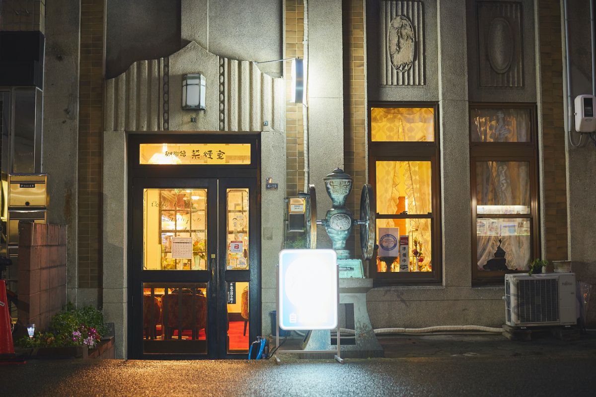 2021年9月、大阪メトロ中央線・千日前線阿波座駅から徒歩7分の場所に誕生した「喫茶 水鯨」。旧川口居留地に立つモダン建築は、昭和初期に建てられた鉄筋コンクリート建ての洋館。扉は石川県金沢市で50年近く営業していた名物純喫茶「珈琲館 禁煙室」から移築されたものなのだそう。