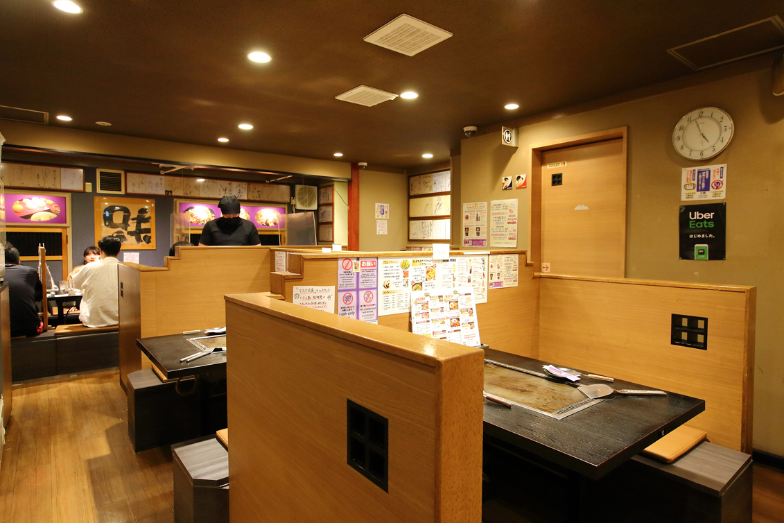 広々とした店内は全48席。カウンター、テーブル、座敷があり、カップルでもグループでも気兼ねなく利用できます。鉄板で焼けるお好み焼の音やそれを楽しむ客さん、俊敏なスタッフさんの対応など、お店は活気にあふれ明るい雰囲気です。