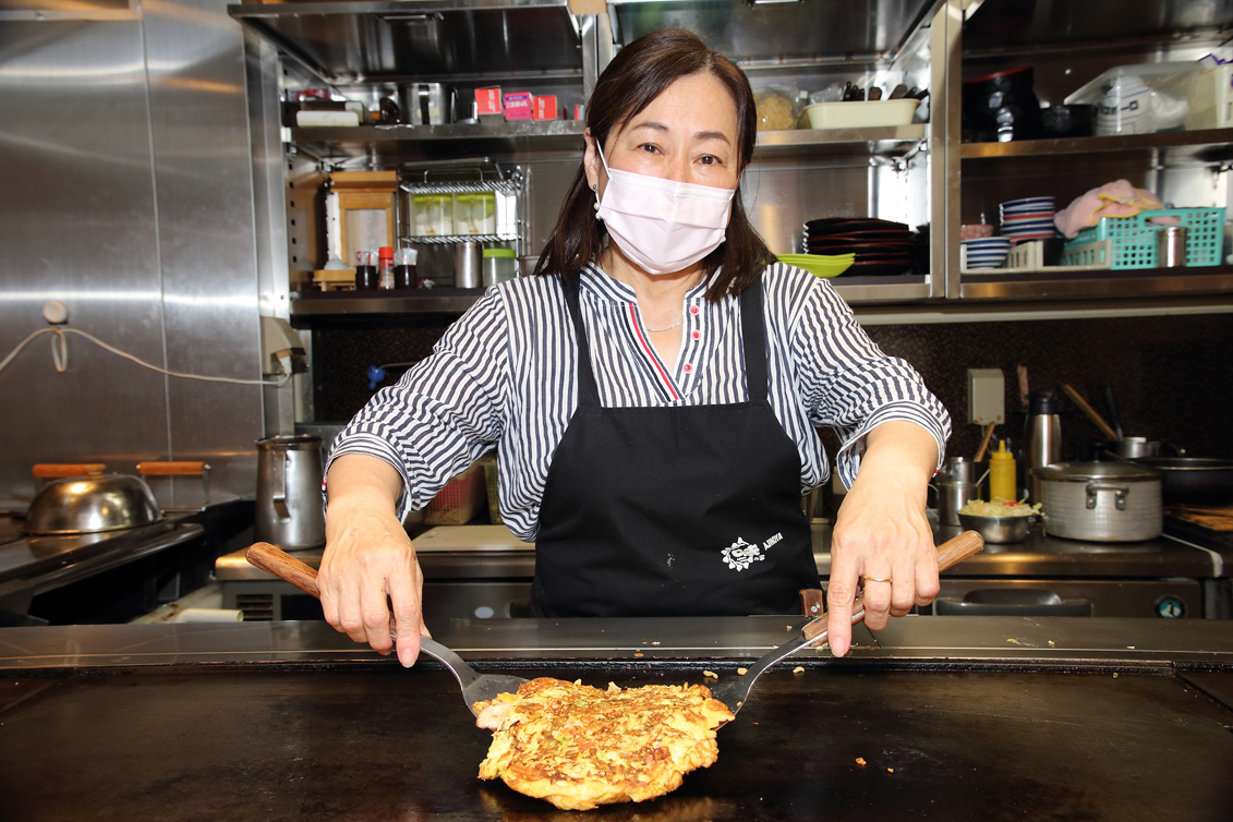 目の前でお好み焼を焼いてくれるライブ感たっぷりのスタイルは、お好み焼には欠かせませんよね。食事だけでなくエンターテイメントとしても楽しめます。この日カウンターで店こだわりの焼き方を披露してくれたのは、女将の空山嘉津子さん。マスクをしていて隠れていますが、笑顔が素敵で元気いっぱいのべっぴんさん! ぜひ会いに来てください。