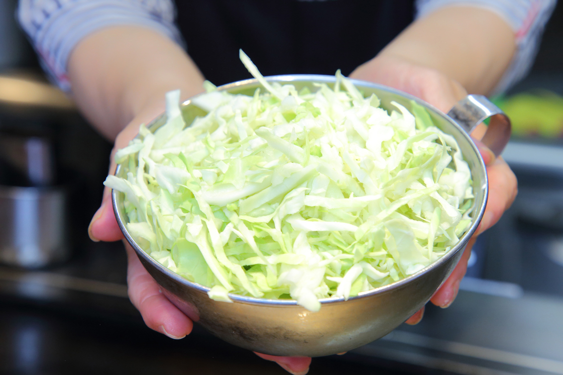 嘉津子さんがまず手に取って紹介してくれたのはキャベツ。そう、ここ味乃家が徹底してこだわっているのがキャベツの品質。その時期に一番甘くて水分を含んだ新鮮なキャベツを産地にこだわらず厳選して仕入れています。「キャベツの甘さとみずみずしさがうちのお好み焼のみそやねん」と嘉津子さん。多い日には大玉で40~50玉出ることもあるそうで、(ここだけの話)卸値が高いときでもメニュー価格は据え置き。そこまでこだわるキャベツの魅力を最大限に引き出すためには、焼き方にも秘密があるんです。