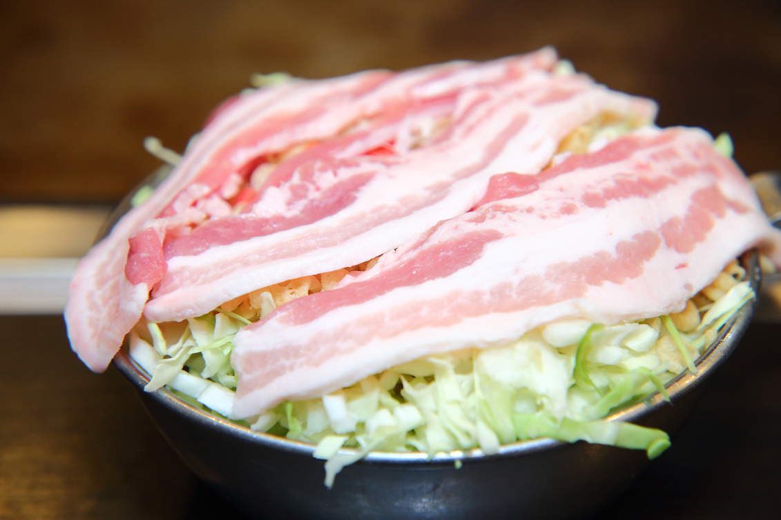 一番人気は豚、イカ、タコ、エビ、ミンチ、卵2個が入る豪華な「味乃家ミックスお好み焼き」1380円なんですが、今回はあえてシンプルに、「豚玉」で味乃家のお好み焼の魅力に迫っていきます。まずはゴマ油をひいた鉄板(これが良い香り♪)に豚のバラ肉を3枚敷きます。そして、キャベツと生地を混ぜるのですが、味乃家の生地はだしや山芋が入るネタは極少量で、つなぎは卵がメインです。だしの風味を最低限効かせつつも、キャベツそのものの味わいを優先します。