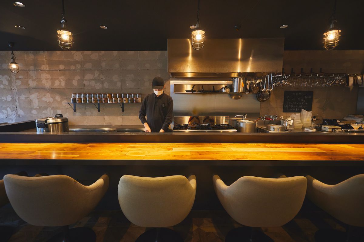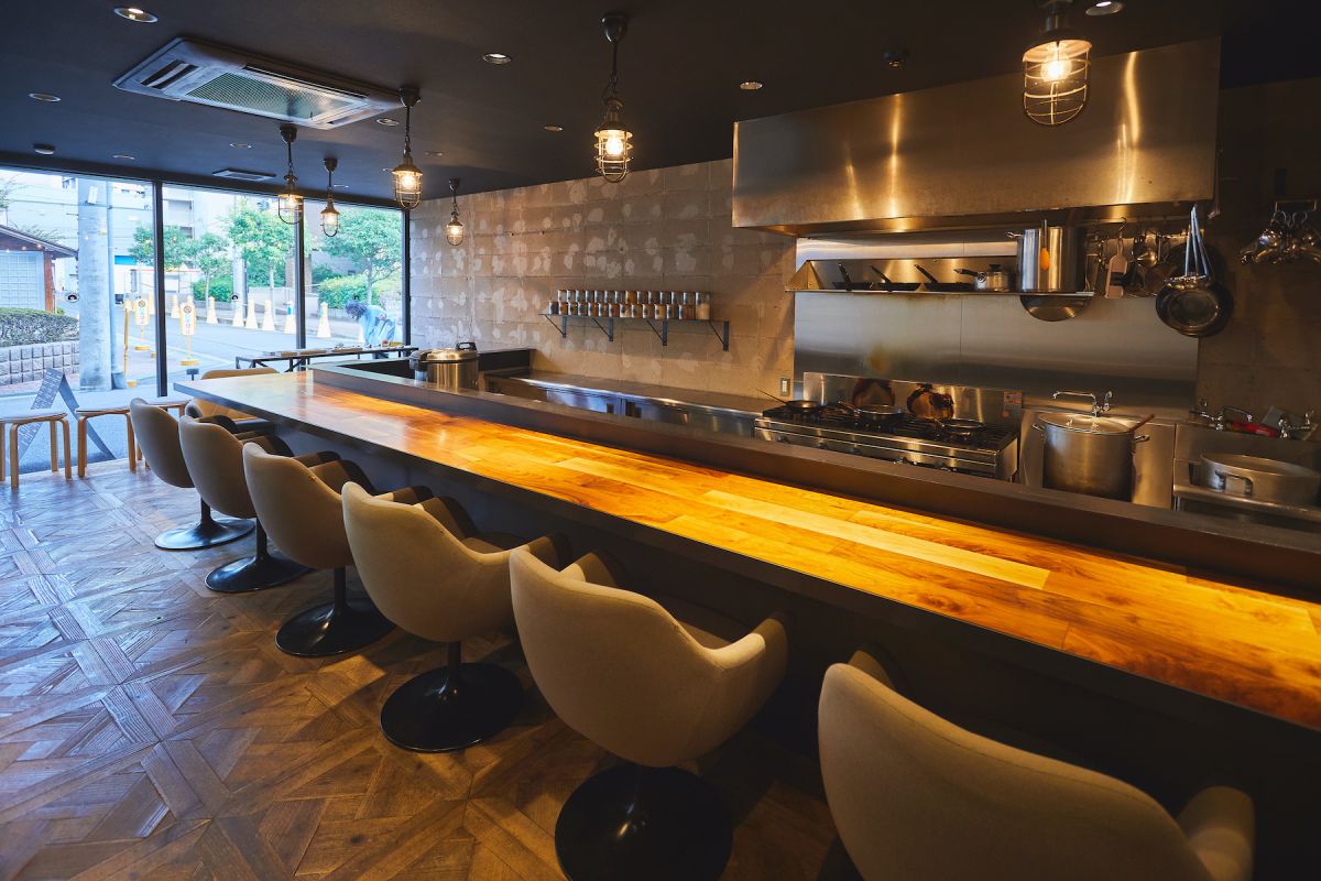 席は厨房をぐるりと囲むカウンターとテーブル席。椅子は座面、背もたれ、肘掛けともファブリックで覆われたソファタイプで、一人ひとりがゆったりとくつろげるタイプ。