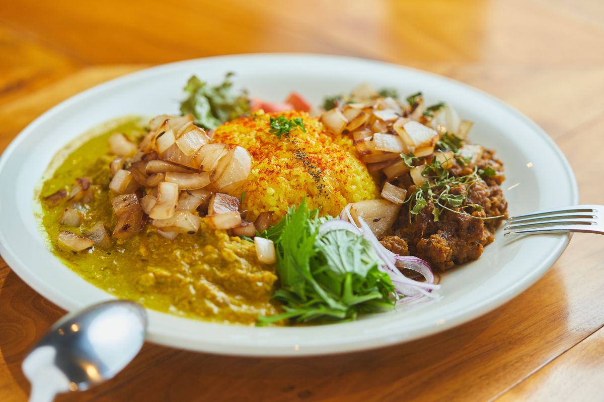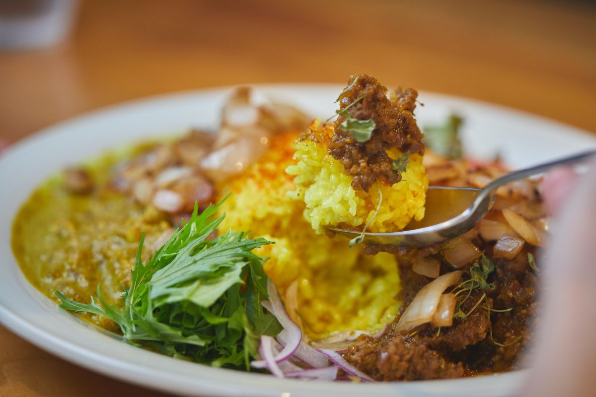 一番人気の「ビーフ&ポークキーマカリー」は、生トマトの水分で作った無水のドライキーマ。スパイスの尖りを8時間炒めた玉ねぎがまぁるく包み込みます。チキンカリーはココナッツベース。グリーンカレー風でココナッツの甘さの中からスパイスの辛さの波が押し寄せてくる感じ。2種類の味のコントラストがすごくはっきりしていて、どちらも美味しい。こっちを食べて、あっちを食べてと交互に楽しめます。