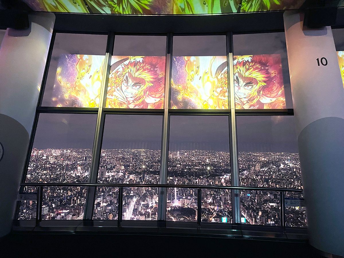 天望デッキ フロア350の窓ガラスを巨大スクリーンに仕立てた「SKYTREE ROUND THEATER(R)」では、夜限定でアニメ「鬼滅の刃」の映像を上映しています。