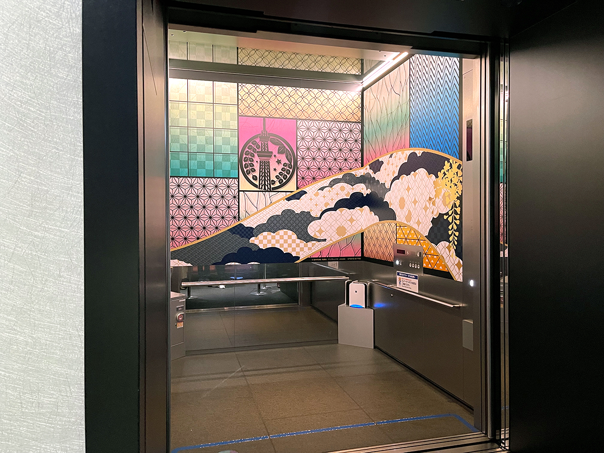 天望デッキから天望回廊に向かうエレベーター内にもオリジナルの装飾が。