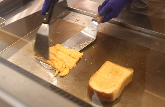 ここでこちらのお店のエッグトーストへのごだわりをご紹介。トーストにはお店用に業者でオリジナル製造してもらう湯種パンを使用し、注文が入ってから表面がサクっとなるまで焼き上げます。中身はしっとりモチモチで甘味もしっかり。卵は京丹波の契約農場から黄身の色が濃く、味も濃厚なものを発注。手際のいい小手さばきで形を整えながら、ふるふるの卵焼きに仕上げてきます。おいしそうな色の濃さもエッグサンドでは重要です。