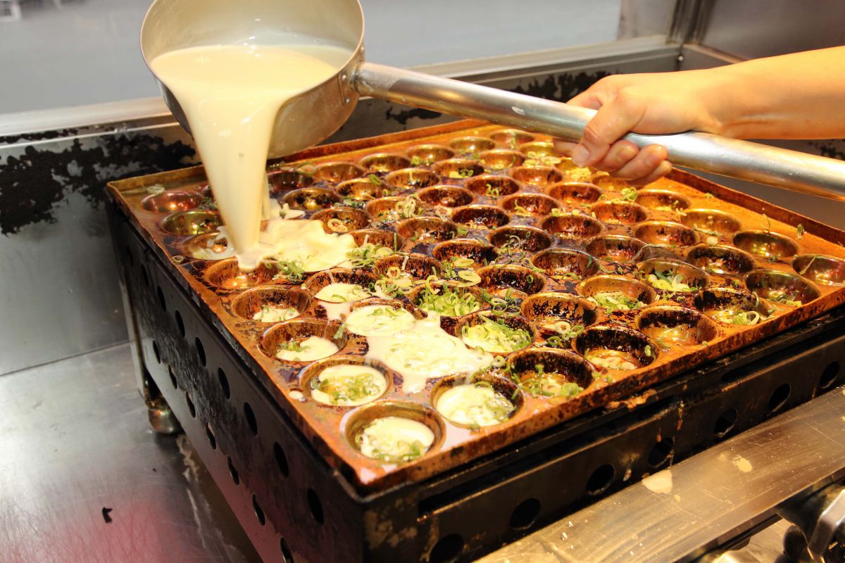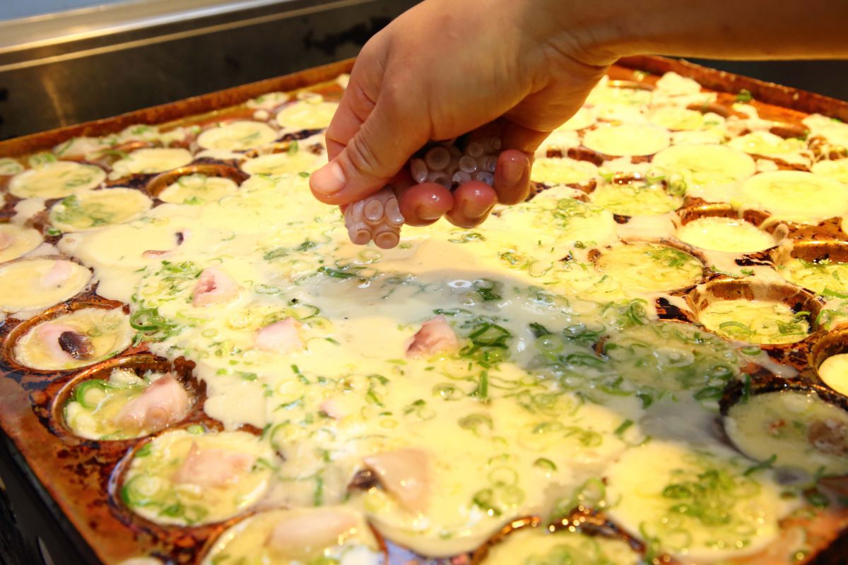 続いて、主役のタコを投入。大ぶりのタコは半生に茹でてあるため、うま味がたっぷりと生地に溶け出します。生地の外側に火が入りかけたら、さらに生地を流し込みます。この追い生地がトロトロ食感を生み出すそう。