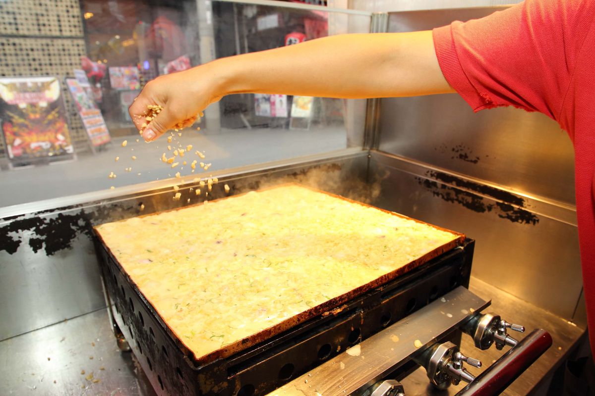 熟練の焼き師による焼き方をウオッチングしながら、「わなか」のおいしさに迫ります。まず特徴的なのが、油を敷いた銅板に先に青ネギを撒いてから火をつけるところ。こうしてネギの香りをしっかり立たせてから生地を流します。生地はカツオと昆布のダシと塩の加減が絶妙で、素焼きでも旨い!