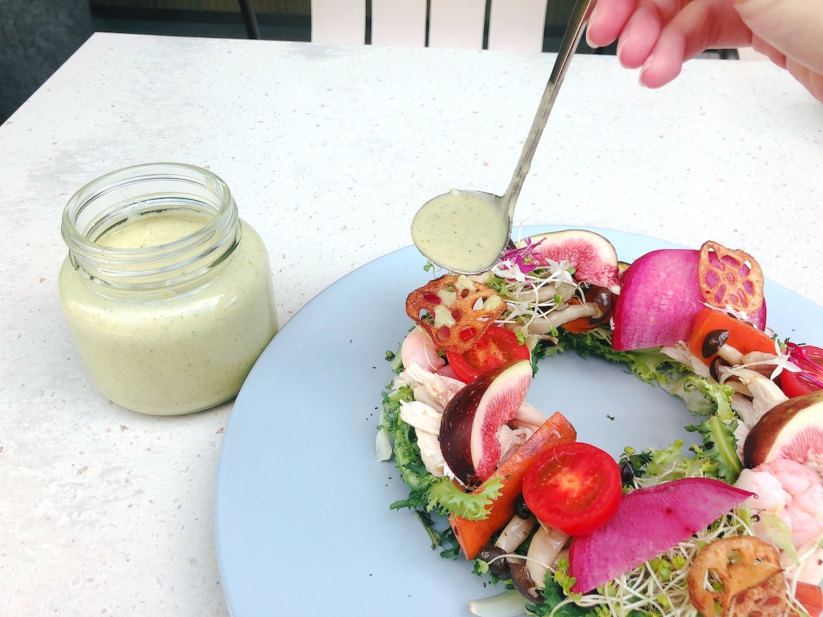 この日はイチジクやカボチャなど秋の食材を満喫することができました。手作りの新玉ねぎと有機大葉のドレッシングは、野菜をおいしく食べてもらうために農家と共同で開発したオリジナルのものなんだそう。玉ねぎと大葉のさっぱりとした味わいはそのままいただきたくなるくらいのおいしさです。新鮮な素材とよく絡んで豊かな風味を口いっぱいに運んできてくれます。