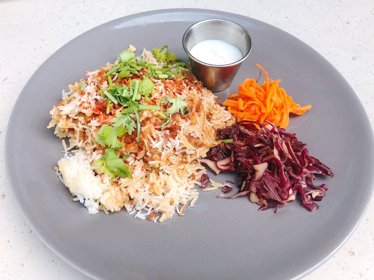 お腹を満たしたいときはランチメニューの「チキンビリヤニ」1400円もおすすめです。鶏肉と10種のスパイス、ハーブを合わせた炊き込みご飯は香り豊かで食が進みます。途中からはヨーグルトソースをかけて、酸味がプラスされたさわやかな味わいも楽しんでみて!