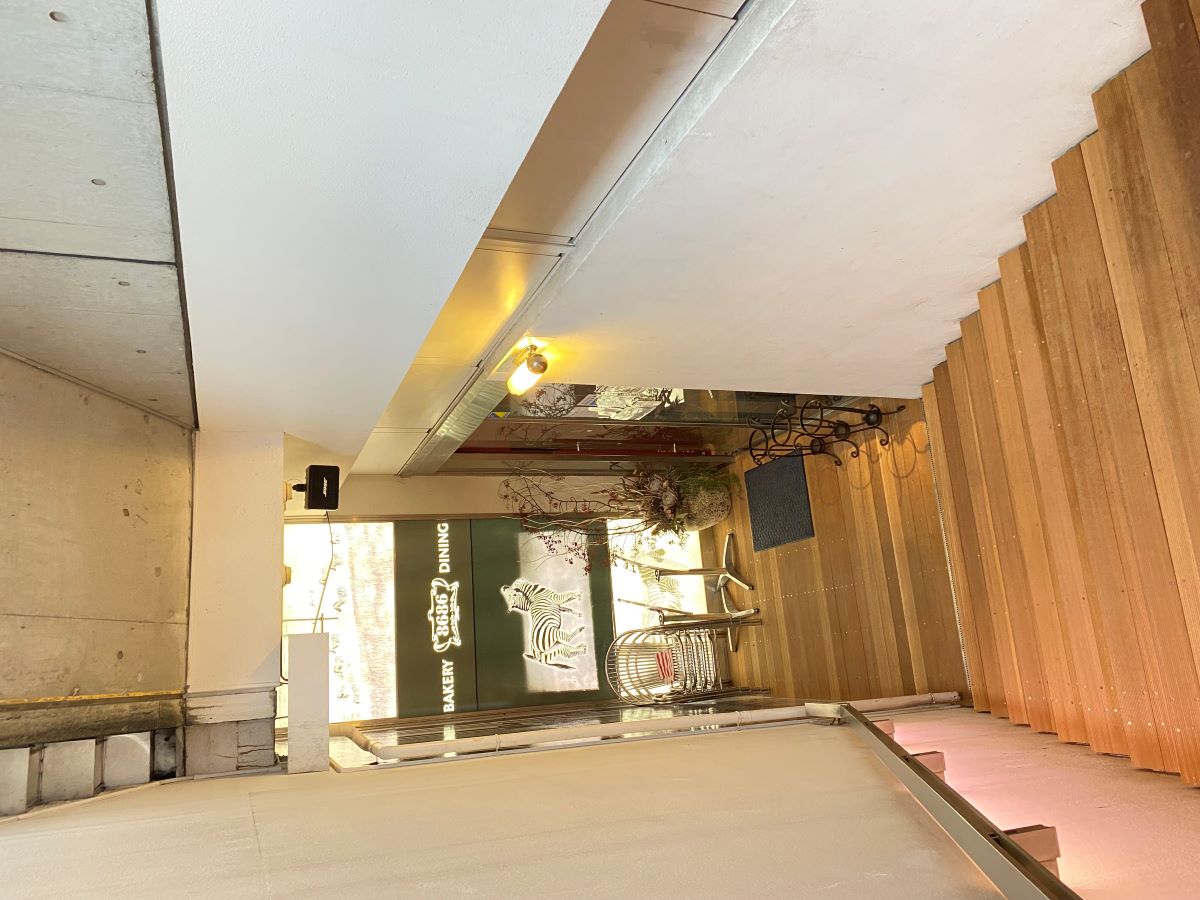 自由が丘駅から徒歩4分。洗練された大人の街に、リニューアルして誕生したのが「BAKERY DINING 8686 JIYUGAOKA(ベーカリー ダイニング ハチロクハチロク ジユウガオカ)」です。お店は地下になっており、こちらの階段を下りた先にあります。