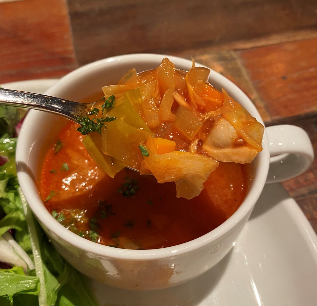 付け合わせにはサラダかポテトを選ぶことができ、さらには具だくさんスープまで付いています。これで1320円はコスパも抜群!大満足なひと品です。