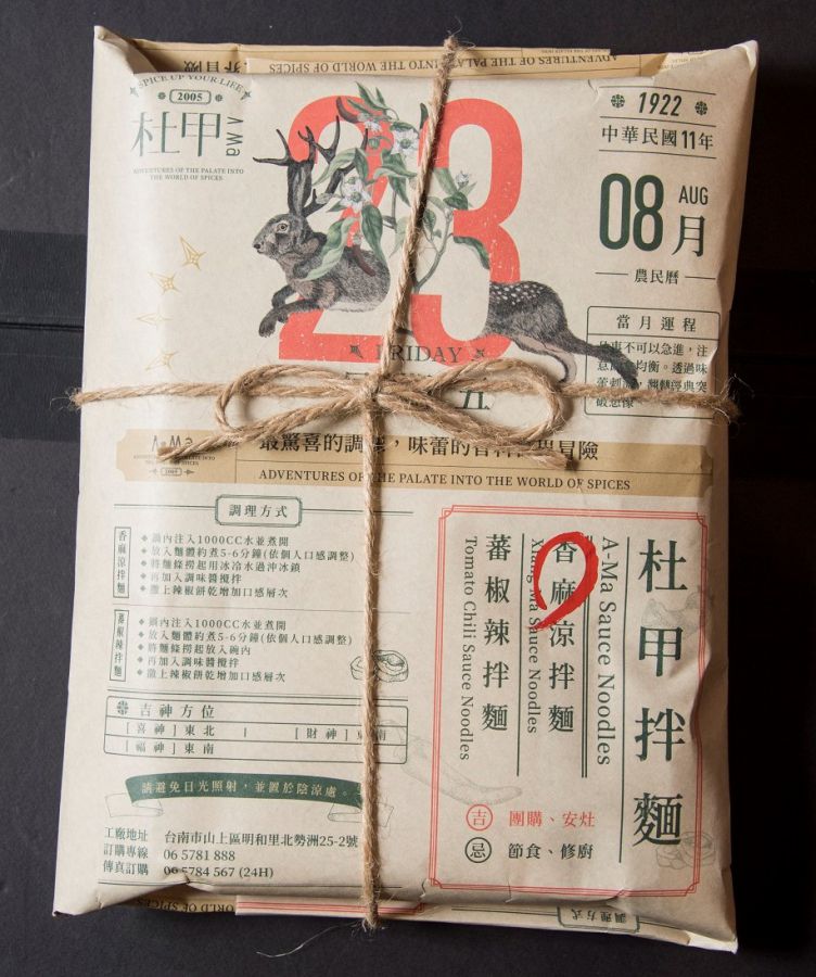 台湾風混ぜ麺セット「杜甲香麻涼拌麵」 (2食入り/300元)もぜひチェックしたい商品。パッケージのレトロなカレンダー風のデザインは、 杜甲おばあちゃんの生まれた1922年8月23日の日付になっているんですよ。