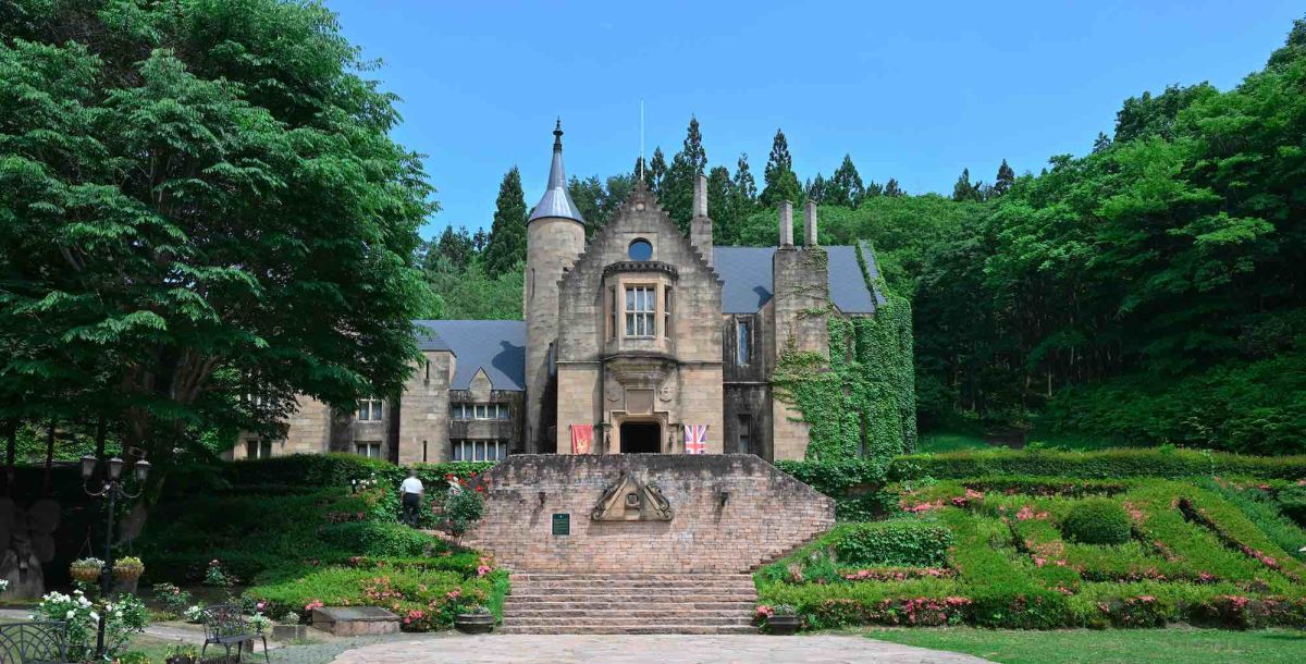 「ロックハート城」は中世ヨーロッパの街並みを再現した異国情緒あふれるテーマパーク。その中心となっているのは、1829年にスコットランドのローズバンク村に建てられ、1993年に群馬県高山村に移築・復元された本物の古城です。石畳の道やバラが咲き乱れる庭園を歩いていると、ファンタジーの世界に迷い込んでしまったかのよう。