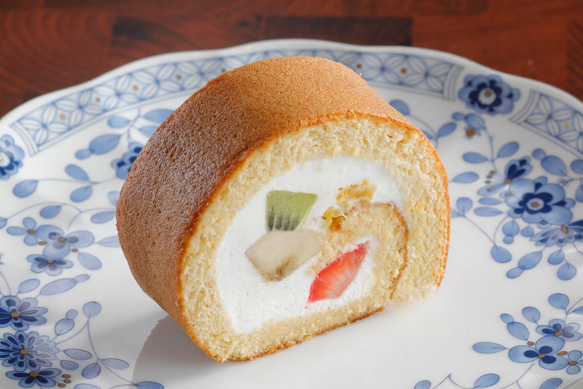 やさしい甘さのスポンジ生地が特徴。黒蜜を使ったスポンジで、生クリーム、いちごなど季節のフルーツを彩りよく配し、やさしく巻き上げました。