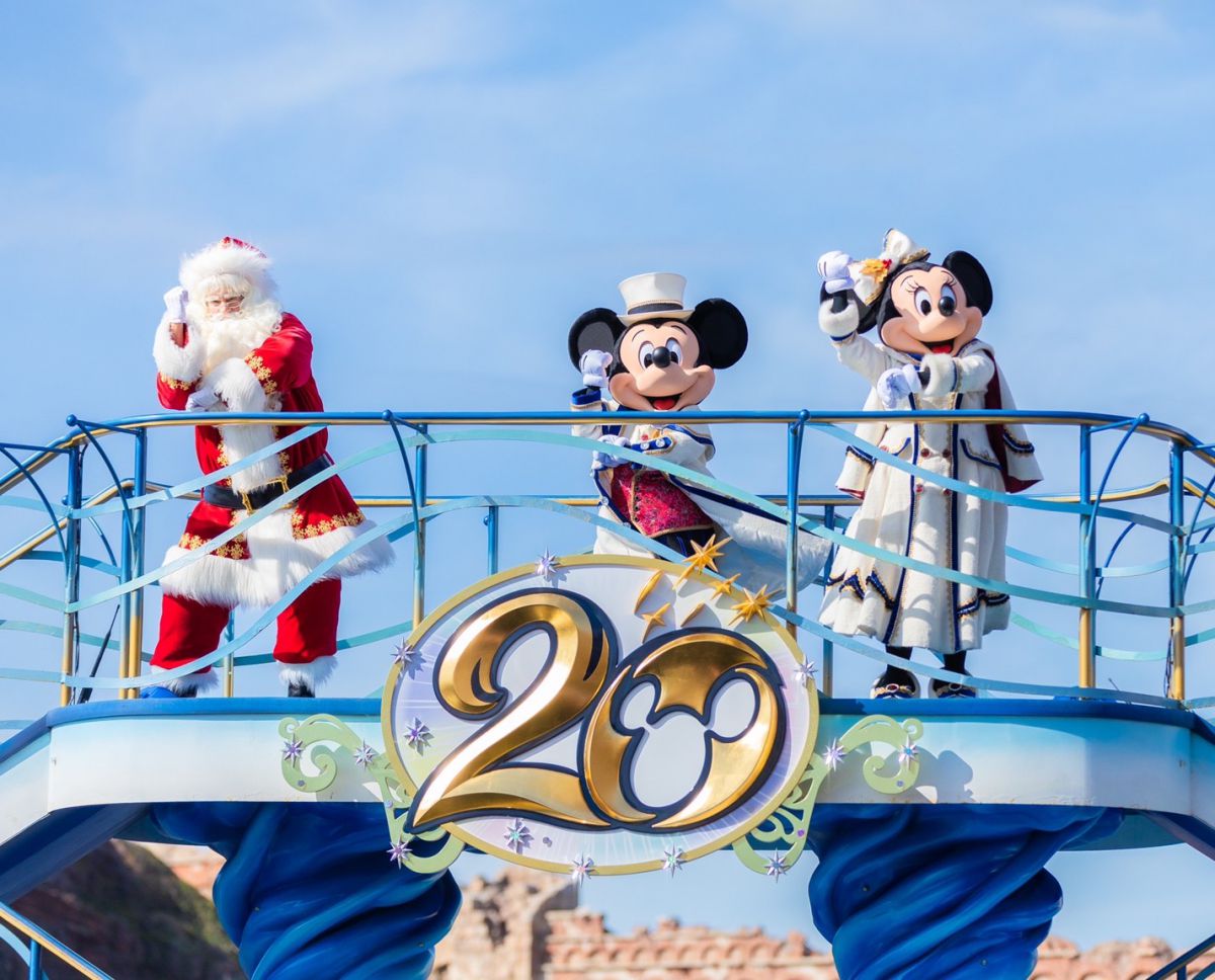 エントランスを抜けて、目に飛び込んでくるのはミラコスタ通りに飾られた、20周年のロゴとキャラクターを描いたデコレーションとクリスマスツリー。ワクワク感がたまりません。