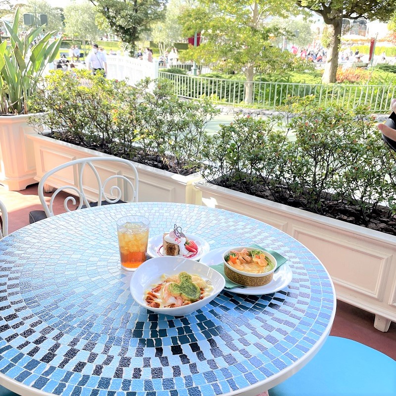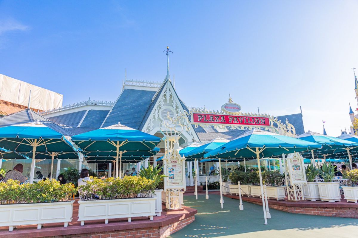 「プラザパビリオン・レストラン」でランチするならテラス席がベスト!ちょうどパレードの時間と重なればパレードが垣間見れたり、向かい側にある「プラザパビリオン・バンドスタンド」でのキャラクターグリーティングの様子も見れたりしますよ。