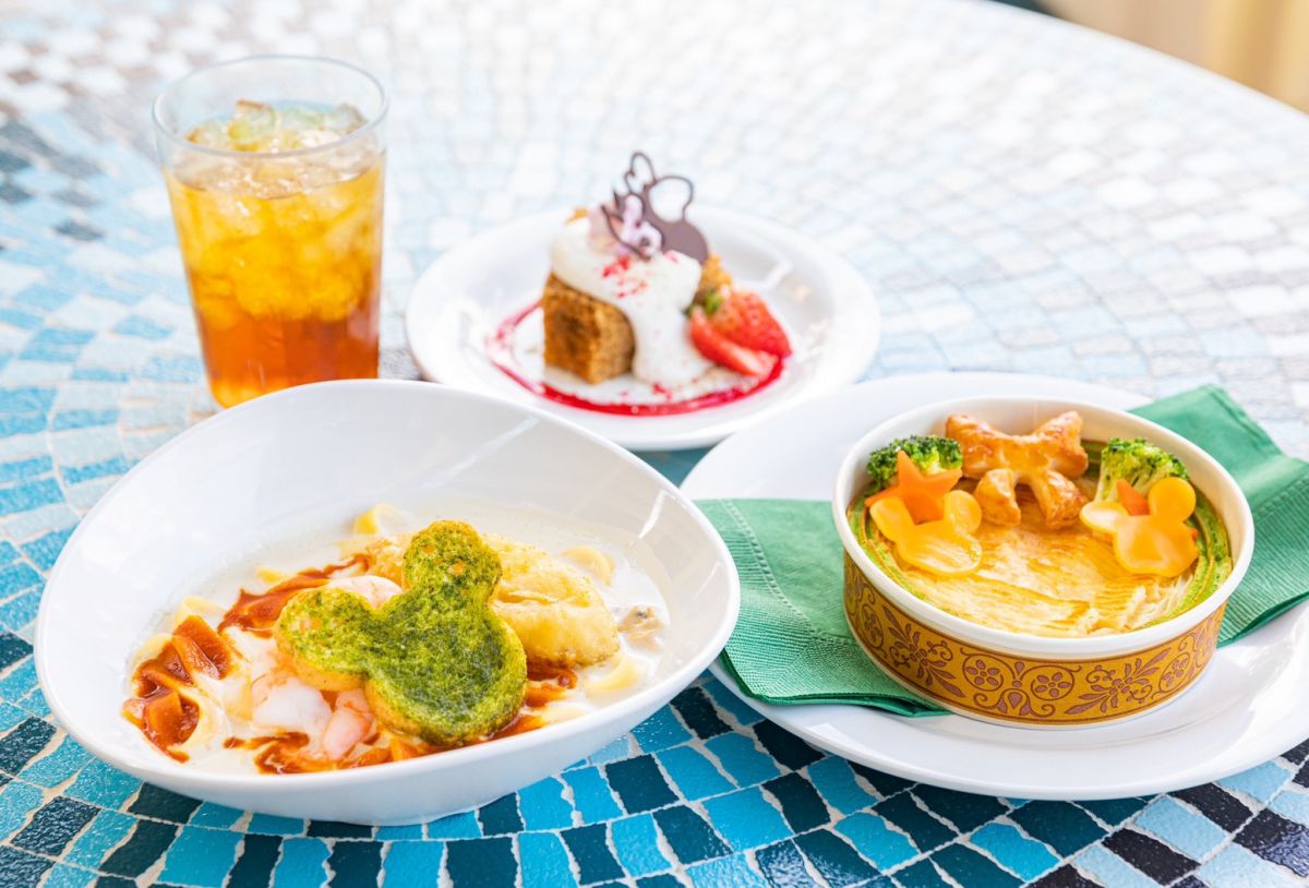 パスタはクラムチャウダーにフィットチーネをあわせた一皿。ぷりぷりのエビや白身魚のフリット、ミッキー型のバジル風味ラスクも添えられていて満足度大。ほんのりとカレー味もして味わいも楽しめました。