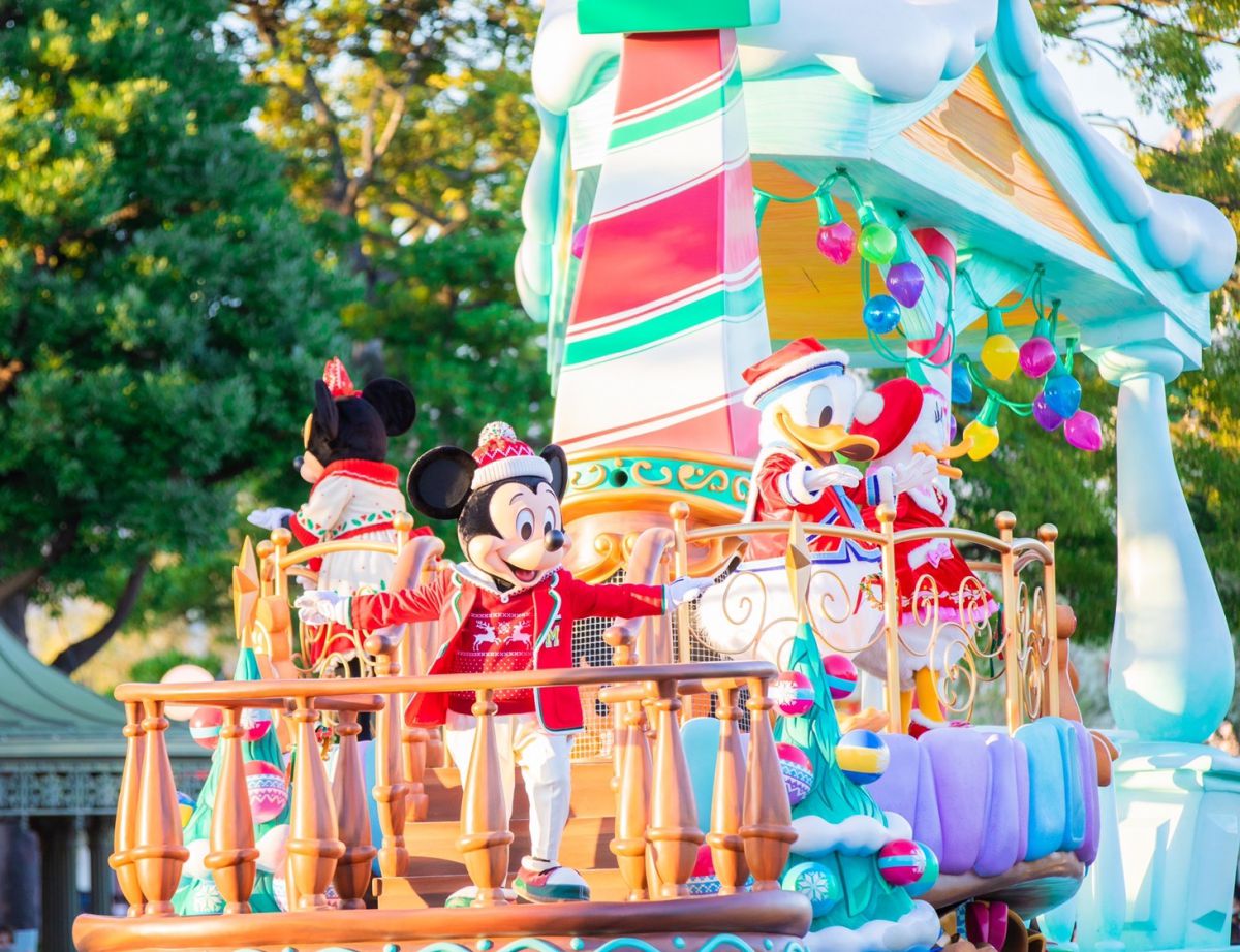 パレードルートで開催される「ミッキー&フレンズのグリーティングパレード」。1台のフロートにミッキー、ミニー、ドナルド、デイジー、プルートがのっていて、楽しそうにクリスマスソングを歌う姿にほっこり。