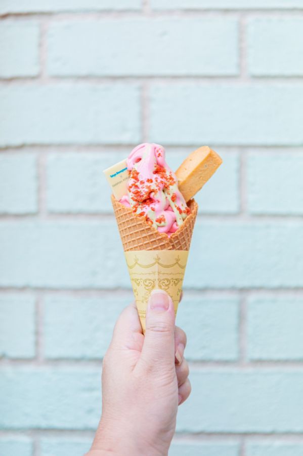 気になるコラボソフトは「ストロベリーホワイトチョコ&ピスタチオソース」600円。ストロベリー味が効いていてさっぱりとした味わいでした。ピスタチオはソースなので、ピスタチオ味を期待していくのはNGかも。